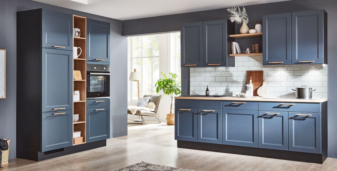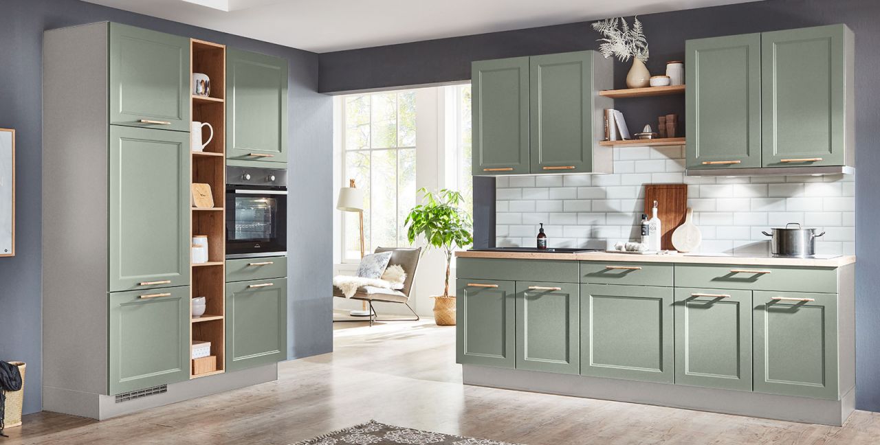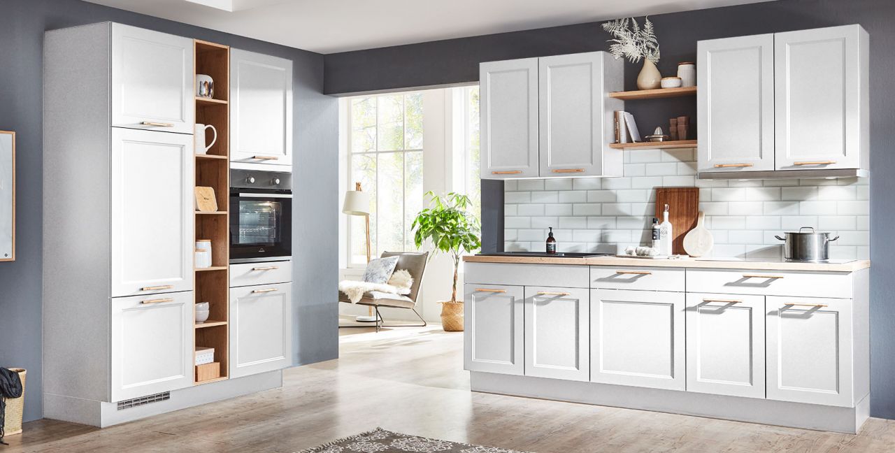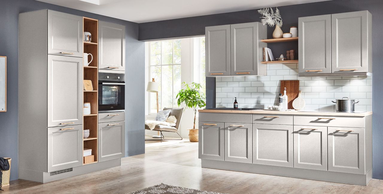Inklusive Einbaubackofen Edelstahl Progress PBN13002X Energieeffizienzklasse A, Glaskeramik Kochfeld Progress PAS6001E, Flachschirmhaube Progress PDP9040E Energieeffizienzklasse A, Kühlschrank Progress PK0813 Energieeffizienzklasse F, Einbau-Designspüle Elleci Logik 300, Wandborden, Hochschrankregal.